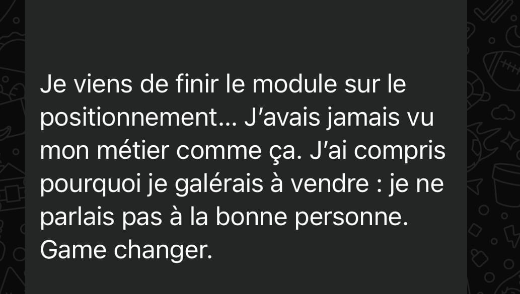 Tu vas apprendre à reprendre le contrôle de ton positionnement, de ta promesse, de ton pricing et de ta capacité à vendre en seulement 48 heures.