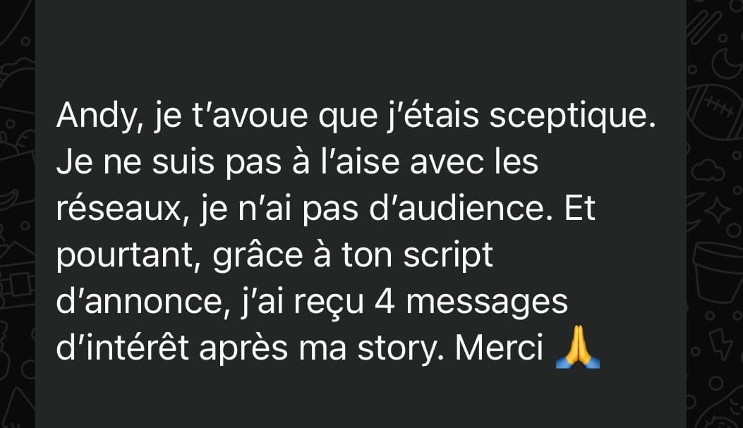 Ce script est basé sur une structure en 5 étapes qui capte l’attention, décrit le problème de ton client idéal, positionne ton offre comme LA solution, et appelle à l’action sans forcer.